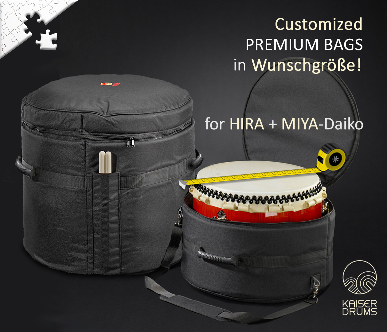 In addition to our previous range of bags, the NEW practical wrapping- bags are now regularly available at KAISER DRUMS for our large Hira-Daiko and O-Daiko. Finaly transport and protection of the large Taiko drums are no longer a problem.